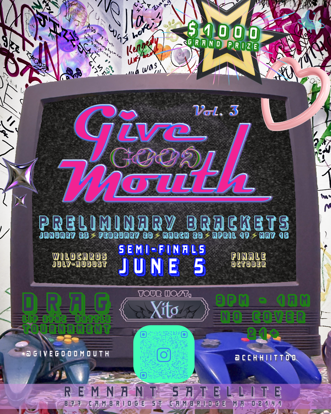 Back to All Events Give Good Mouth (V.3): A Drag LipSync Show! PRIDE EDITION! Friday, June 5, 2026 9:30 PM Saturday, June 6, 2026 12:30 AM Remnant Satellite 877 Cambridge St Cambridge United States (map) Google Calendar ICS Join us every 3rd Friday for new drag performers, songs, monologues, and a cheer-meter to choose Cambridge’s Best Mouth! See head to head competition, with a finalist each week, who will compete in the Finals to win a $1000 Grand Prize!